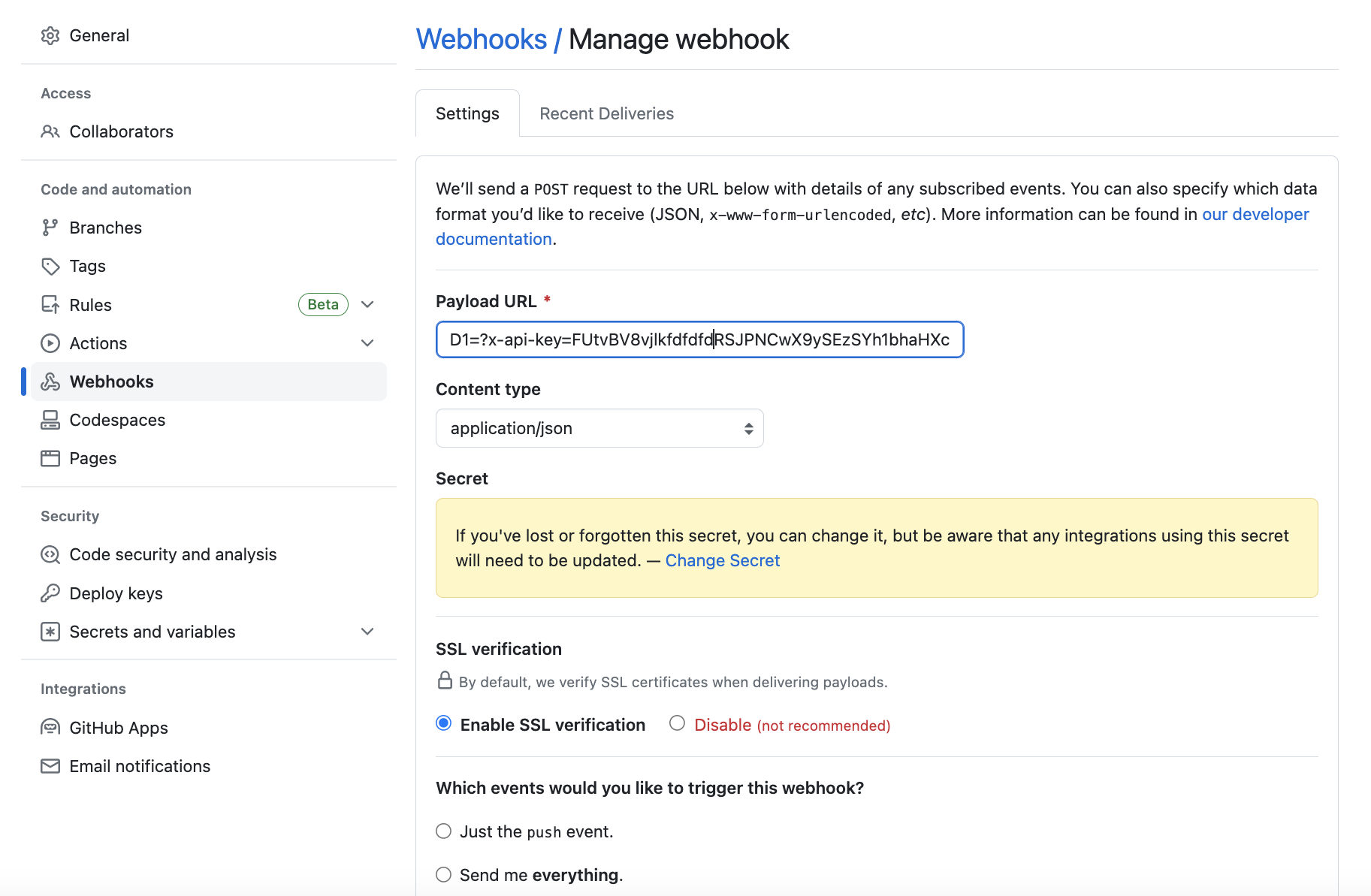 The Payload URL of the GitHub Webhook is based on the Spot Connect Generic webhook API URL and the Spot Connect API Key which was created in Step 3 and selected in Spot Connect scale-up workflow: